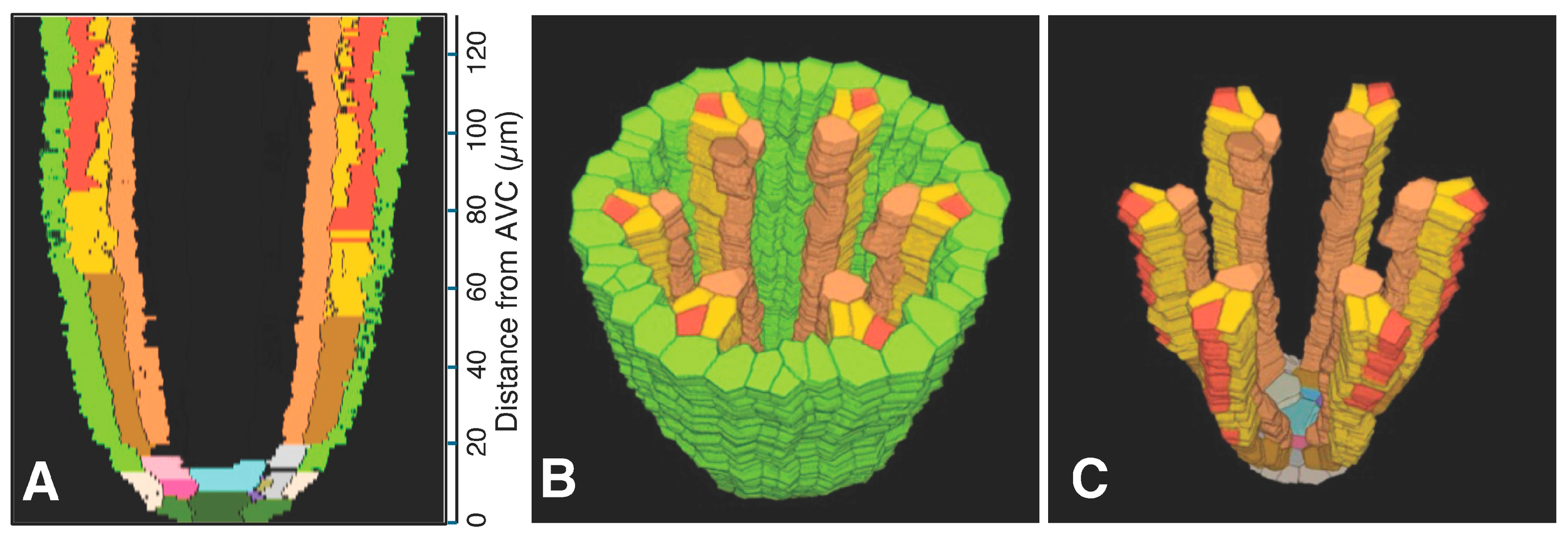 Figure 4. Phloem system. A three-dimensional object was reconstructed from serial sections of a rice vascular cylinder (VC). View angle from above: 60°. Pericycle (GreenYellow), protophloem mother cells (DarkGoldenrod), protophloem sieve tube (Tomato), sieve tube companion cells (Gold), and metaphloem sieve tubes (SandyBrown). Selected initials and plerome cells are shown in various distinct colors at the apex. The apex of the vascular cylinder (AVC) = 0 on the scale. (A) Virtual sectional view of the 3D reconstruction. (B) Bird’s-eye view of the 3D reconstruction. (C) Bird’s-eye view of the 3D reconstruction with the pericycle removed.